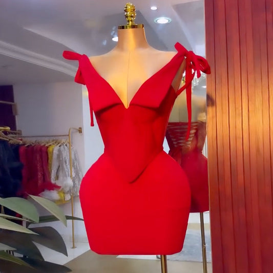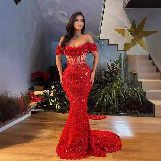 Half shoulder bandeau Red high-waisted evening dress