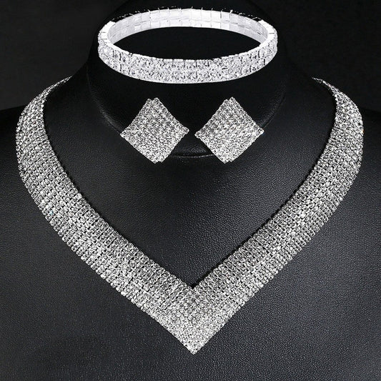 Light luxury rhinestone silver-plated earrings necklace bracelet bridal jewelry