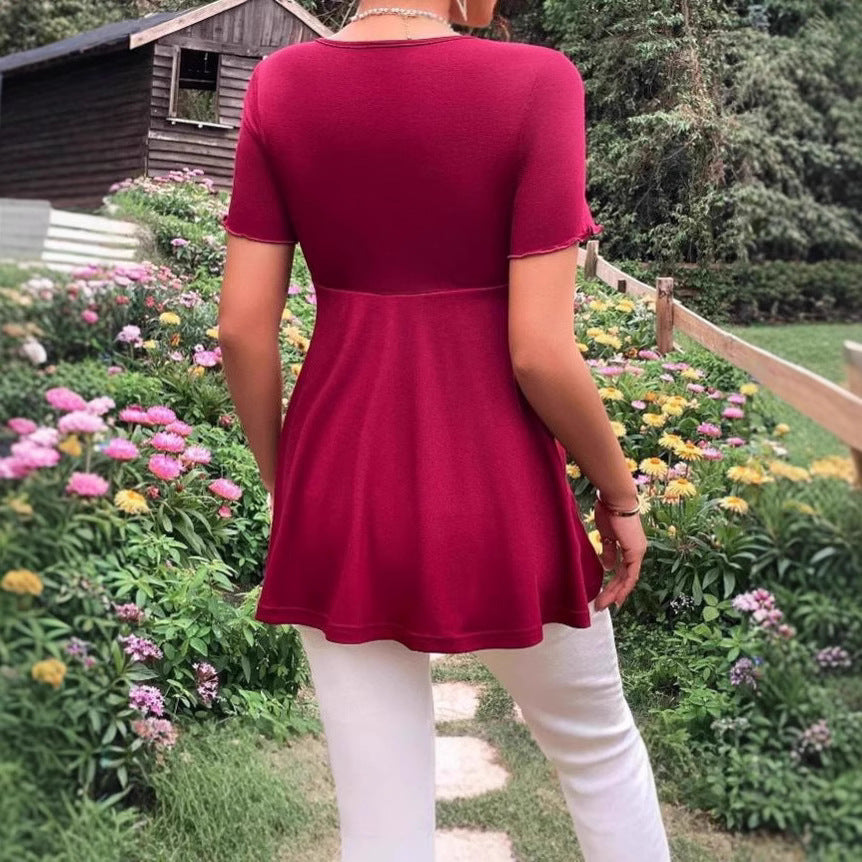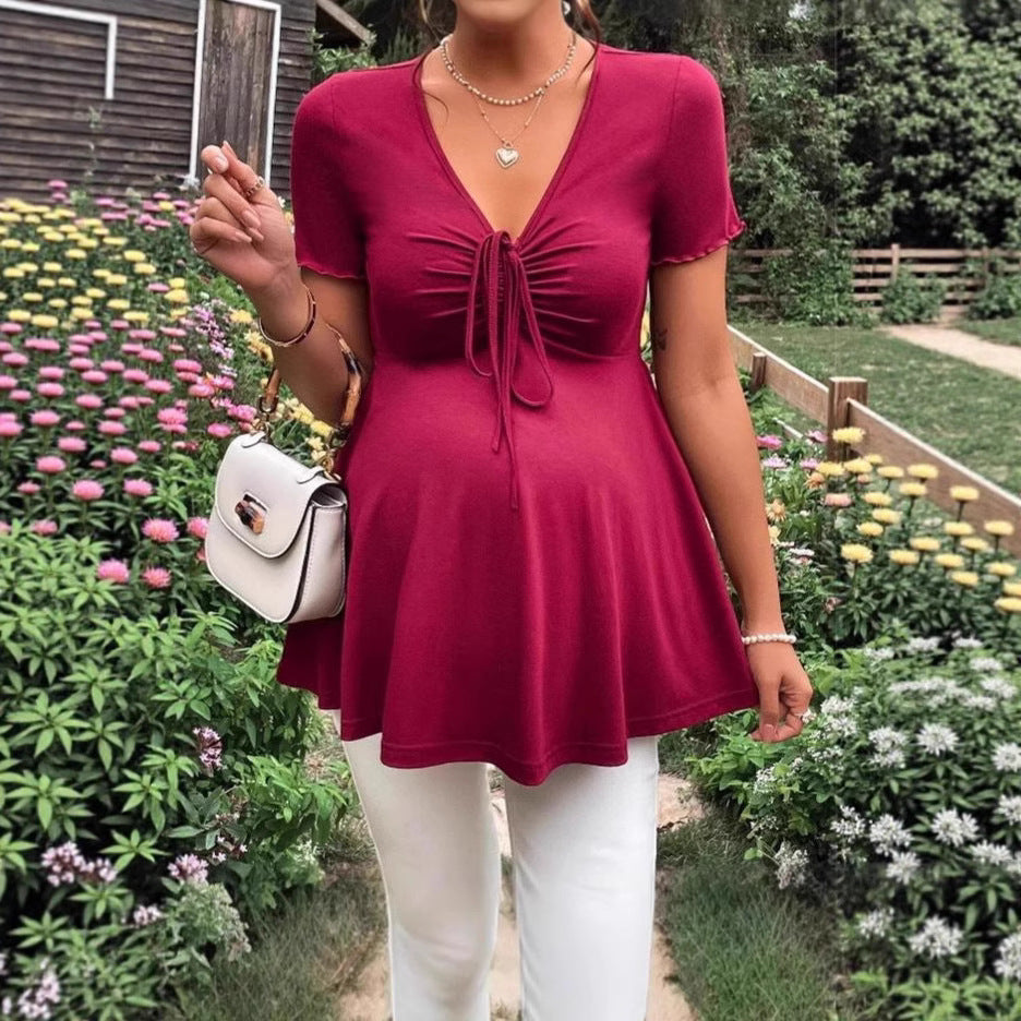 Radiate refined comfort in this V-neck maternity dress, where timeless style meets thoughtful pregnancy design. The delicate drawstring at the bust creates subtle ruching to flatter your changing shape, offering a customizable fit that grows with you no bulky adjustments needed. Crafted from breathable, drapey fabric, this dress keeps you cool while the short sleeves and knee-length silhouette maintain polished versatility. Perfect for baby showers, summer brunches, or casual outings, it transitions effortlessly from day to night when paired with sandals or wedges. The modified V-neckline elongates your frame, while the flowy skirt ensures unrestricted movement. A piece that celebrates your pregnancy glow with understated grace.