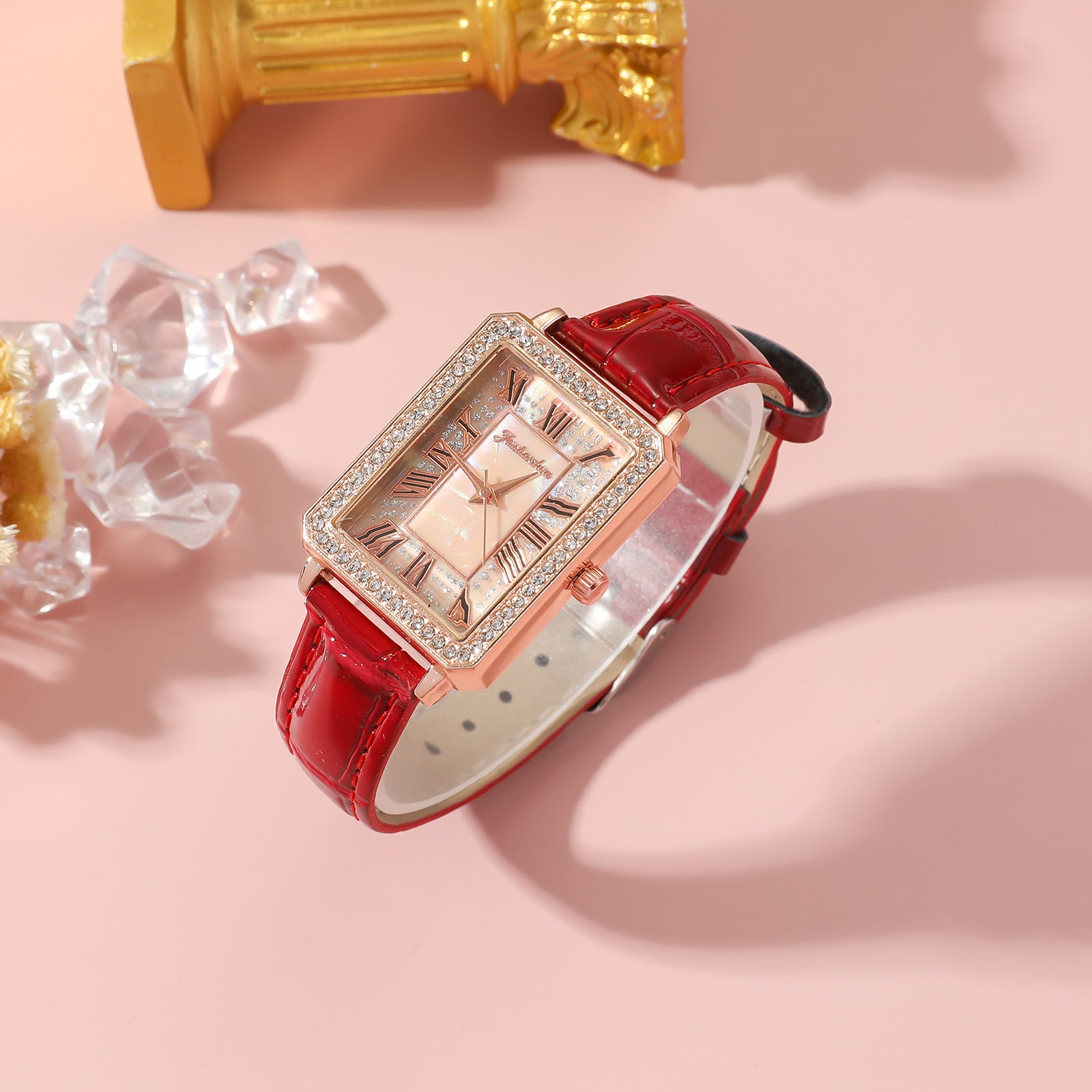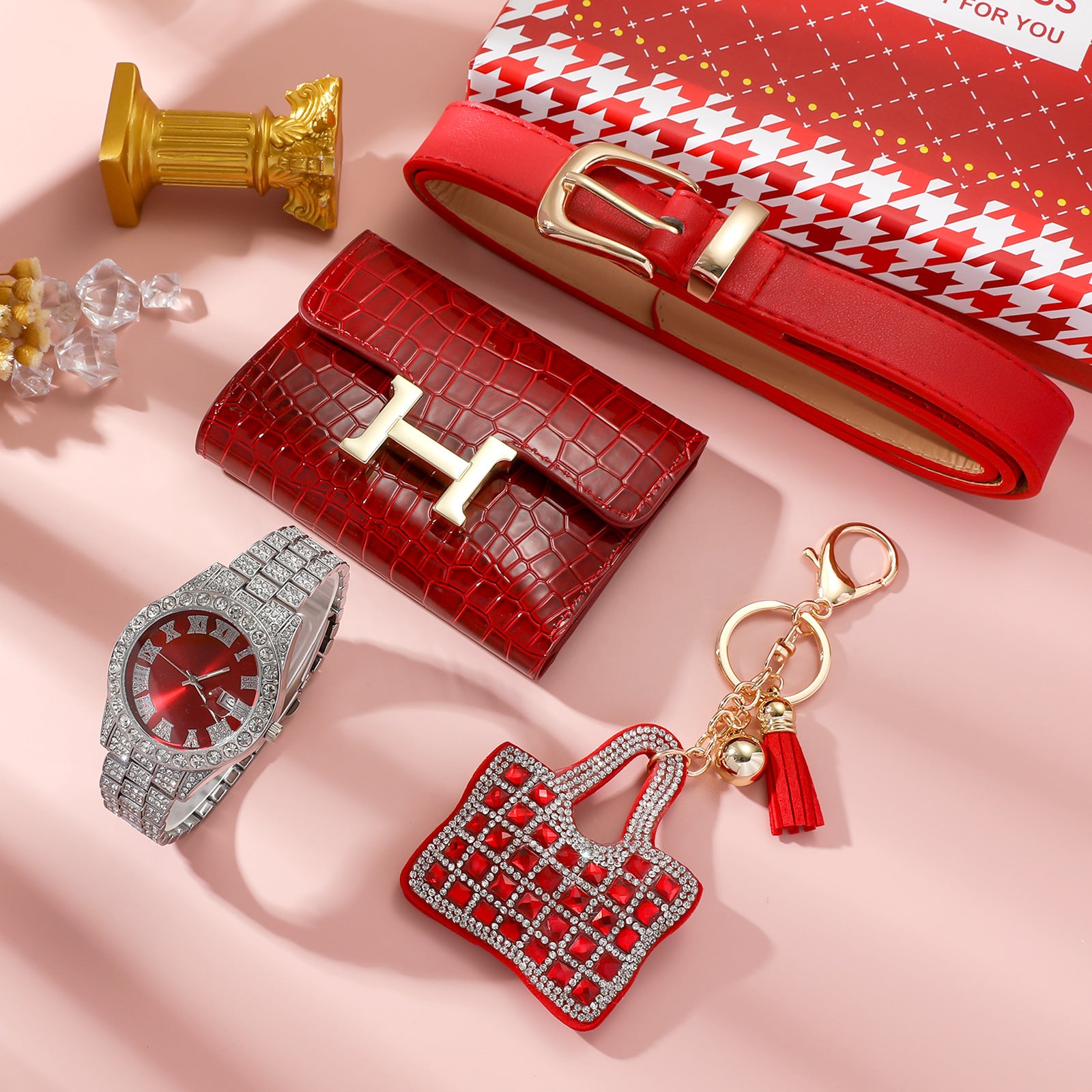 The Elegant Red Women's Watch Gift Set is a thoughtfully curated collection that combines style and practicality. The set includes a sophisticated red watch with a sleek design, a matching wallet, a chic keychain, and a versatile belt. Perfectly coordinated in a premium gift box, this set makes an ideal present for any occasion, blending elegance and functionality for modern women.