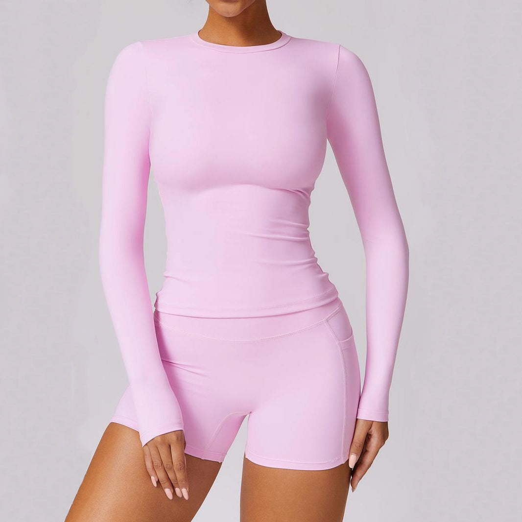 Train in comfort and style with this breathable workout set designed for active lifestyles. The slim-fit, quick-dry top features a round neckline and long sleeves for full coverage, while the built-in pocket shorts offer convenience for essentials.