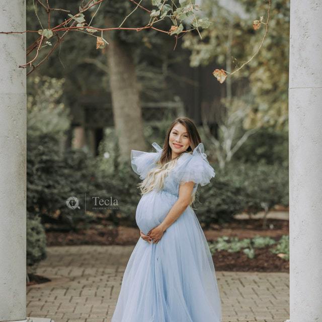 The adjustable waistline grows with you through every trimester, and the flowing train adds drama to every shot. Pair with minimalist jewelry to let the intricate floral details shine.