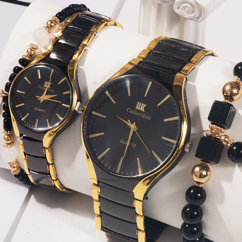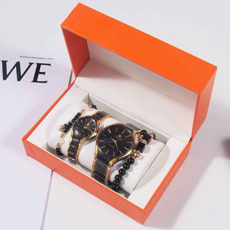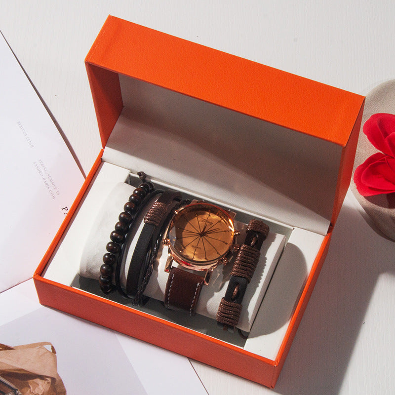 TimeCraft Set is a modern wristwear bundle designed for style and gifting. The set includes a black-faced wristwatch with gold hour markers and a starburst dial, paired with three black bracelets: a braided leather strap, a woven leather band, and a beaded bracelet. Presented in a cushioned display box, it’s ideal for birthdays, graduations, and holiday gifting in Ethiopia. The watch features quartz movement and a stitched leather strap for everyday durability.