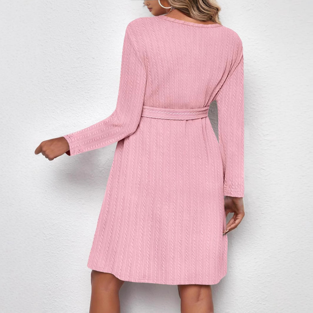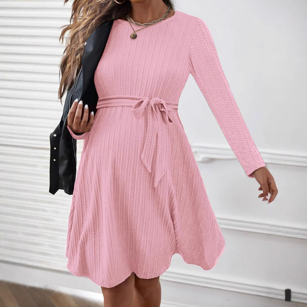 Embrace effortless sophistication with this A-line maternity dress, designed to flatter your growing bump while keeping you elegantly comfortable. The round neckline and long sleeves create a classic silhouette, perfect for transitioning through seasons, while the adjustable waist tie allows you to customize the fit as your body changes. Crafted from soft, breathable fabric, this dress gently drapes over your curves without clinging, making it ideal for work, baby showers, or weekend outings. The flowy A-line skirt offers graceful movement, and the natural belt accentuates your waist for a polished look. Pair with boots and a cardigan for autumn warmth or sandals for a fresh spring vibe this versatile piece is a maternity wardrobe essential.