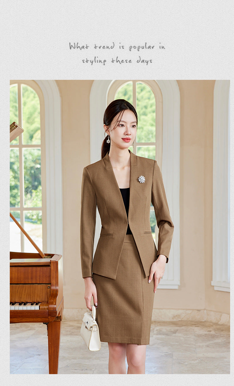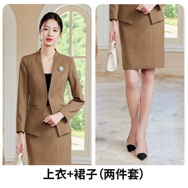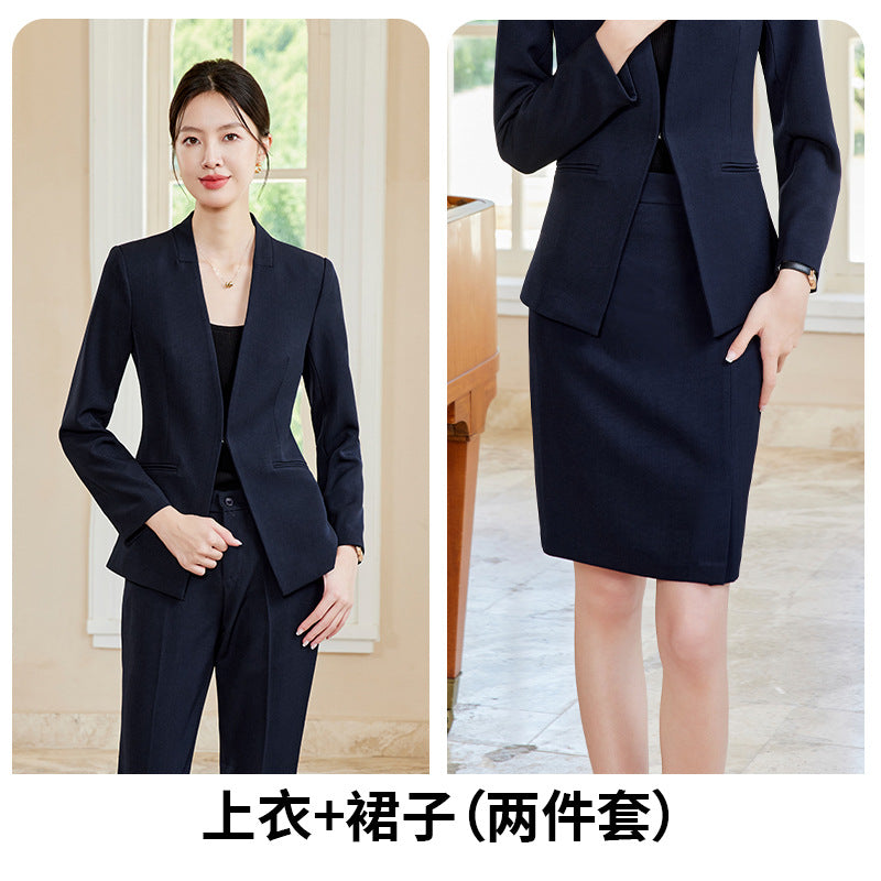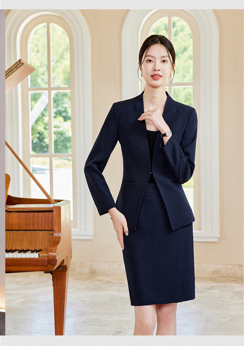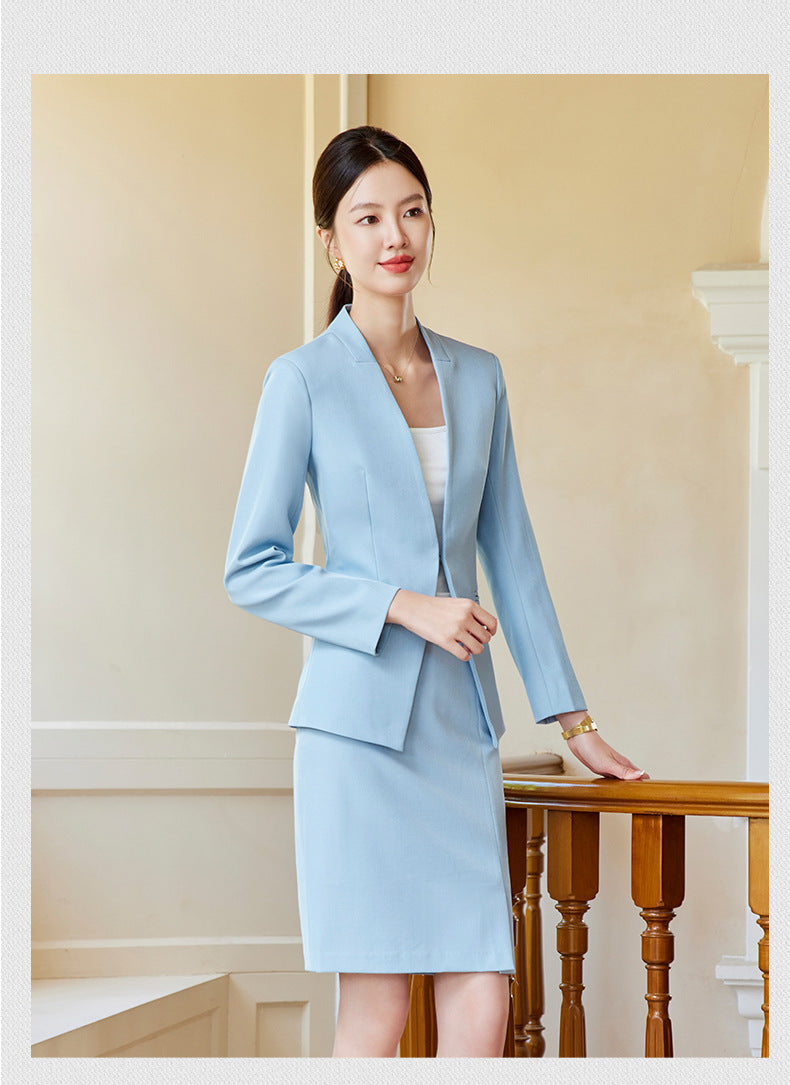 Elegant and stylish V-neck suit set designed for beauticians, jewelry store staff, and front desk professionals. Features a tailored fit with a skirt, ideal for spring and autumn wear. Perfect blend of fashion and professionalism.