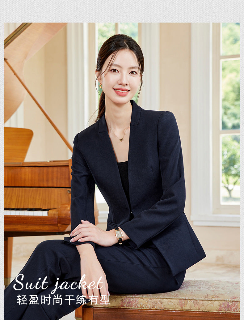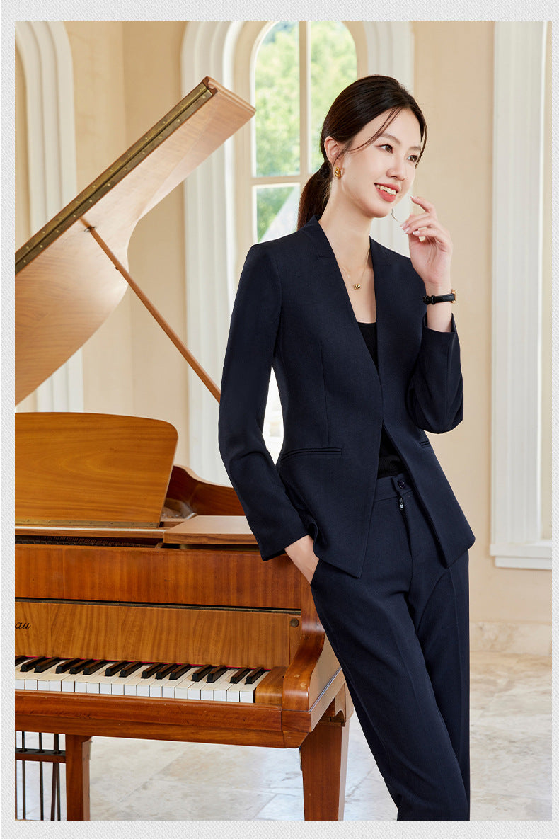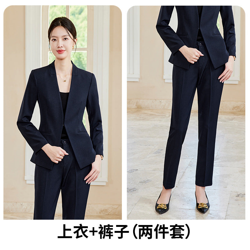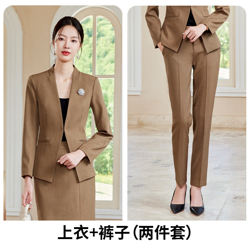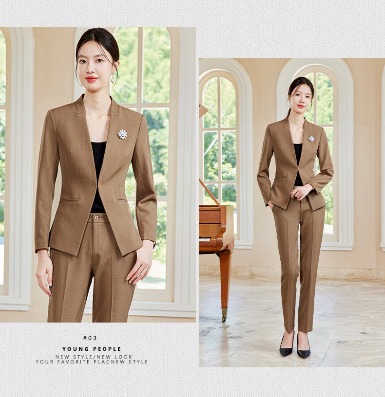 Elegant and stylish V-neck suit set designed for beauticians, jewelry store staff, and front desk professionals. Features a tailored fit with a skirt, ideal for spring and autumn wear. Perfect blend of fashion and professionalism.